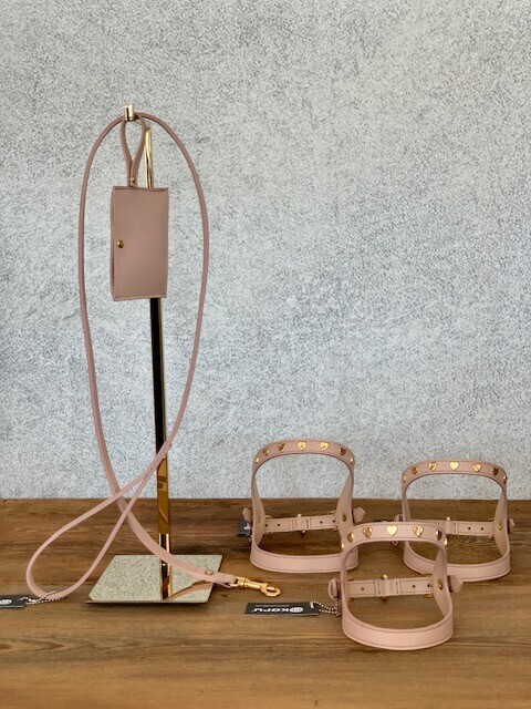 Koru Pet- Glam. Pettorina mod.Emma in morbida pelle, lavorata con concia vegetale, impreziosita da borchie a cuore diamantate color oro, totalmente Made in Italy.Veloce da indossare allacciando e slacciando una sola fibbia. Galvanica light gold. Pulire con un panno morbido.