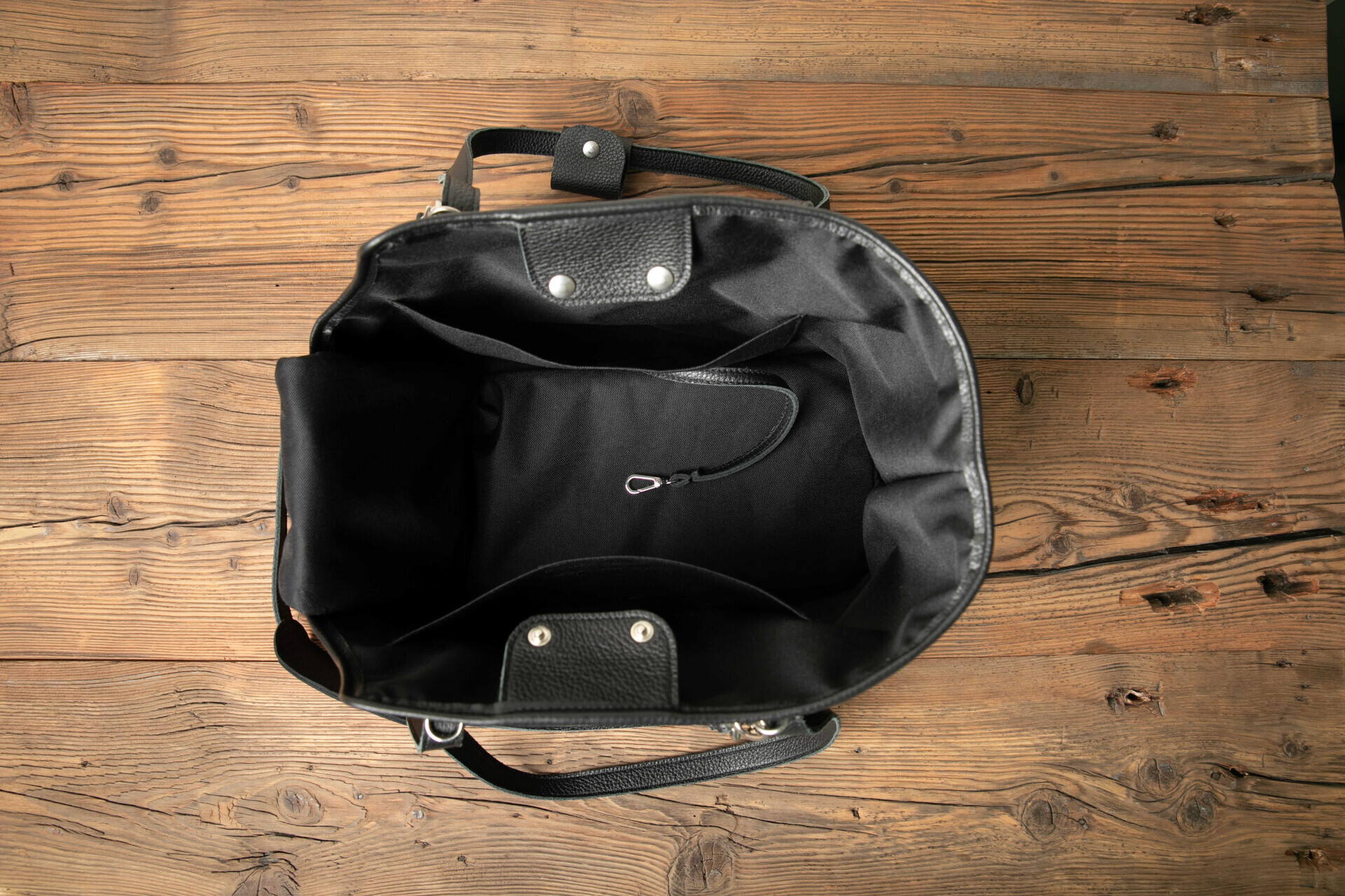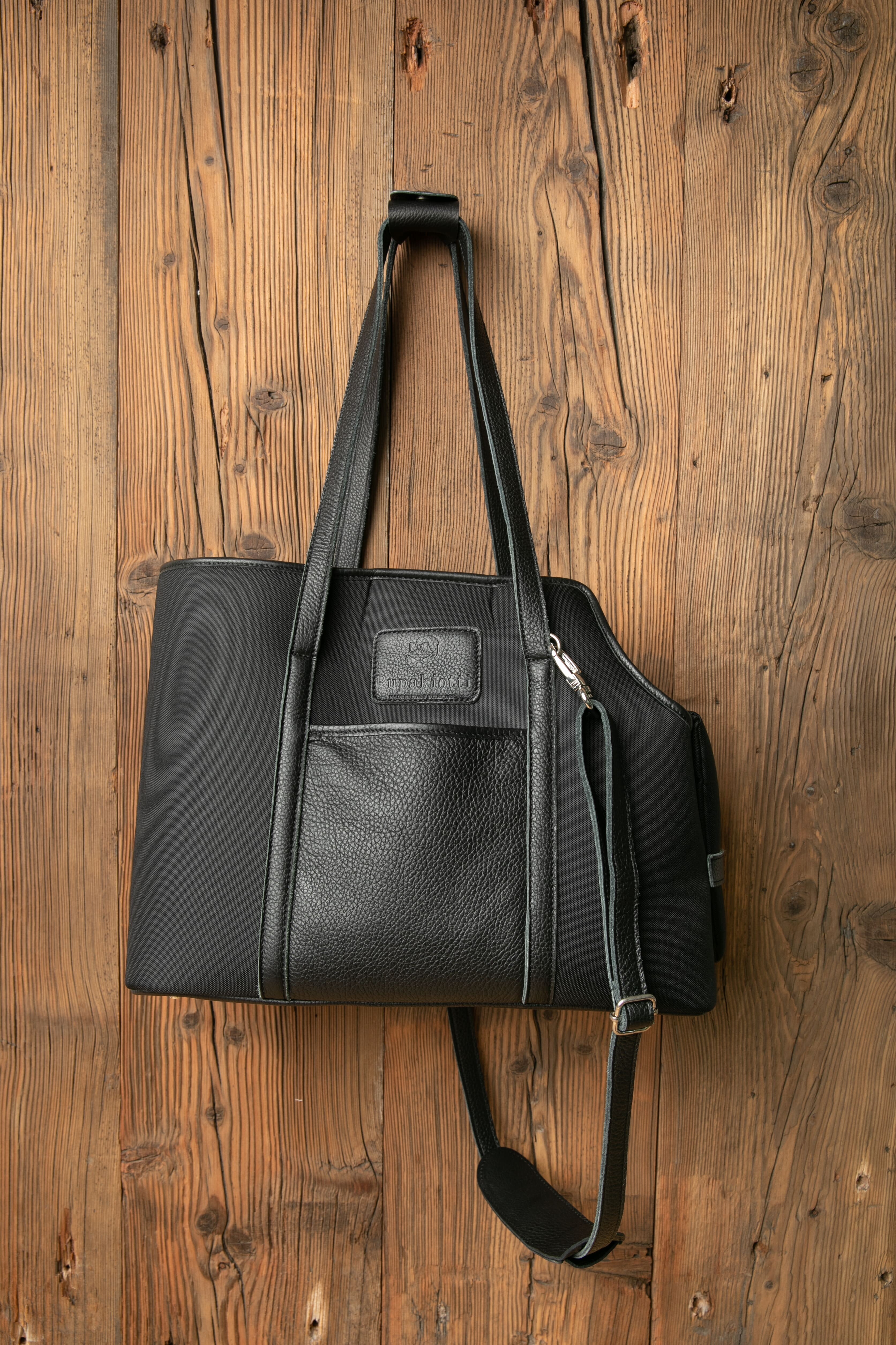 Maniglie, fondo e inserti in vera pelle. Borsa funzionale per la donna, comoda e sicura per il cane. Pluriaccessoriata con :